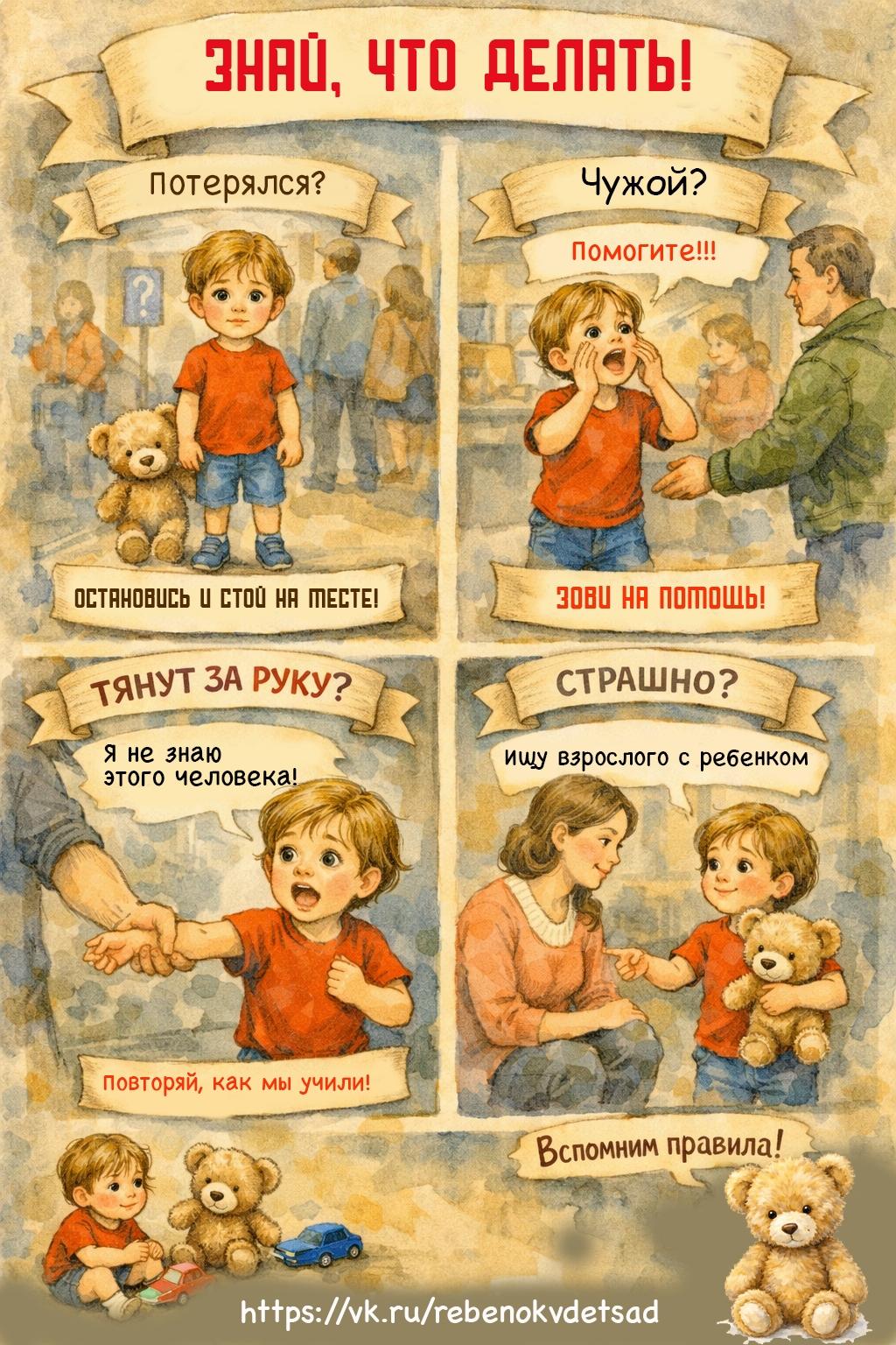 !!! Главное правило "Остановись и стой на месте" Объясните "Если ты потерял маму или воспитателя - не беги искать, а стой там, где ты есть". (Полезно: заранее показать в магазине или ТЦ где касса, охрана, стойка информации.